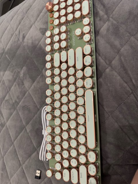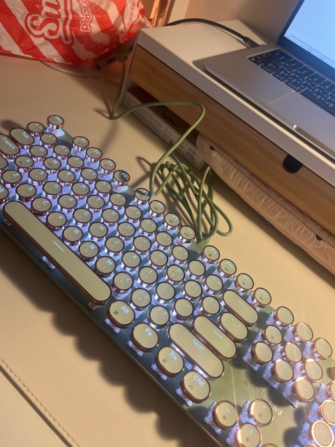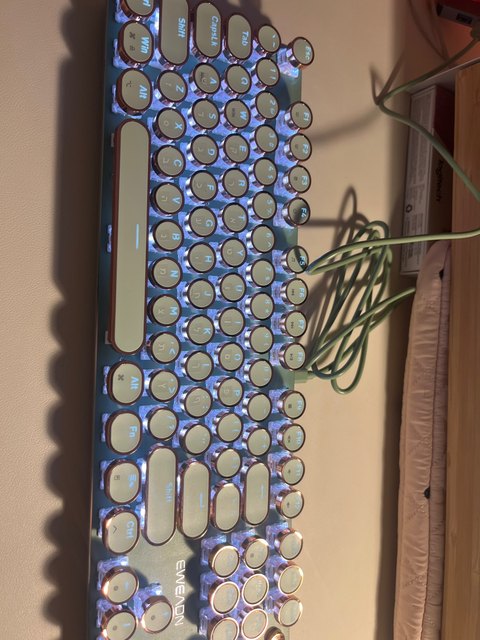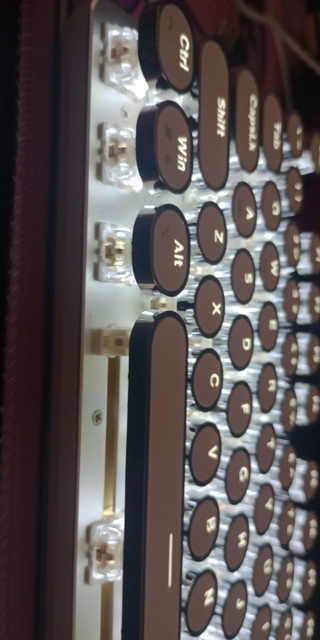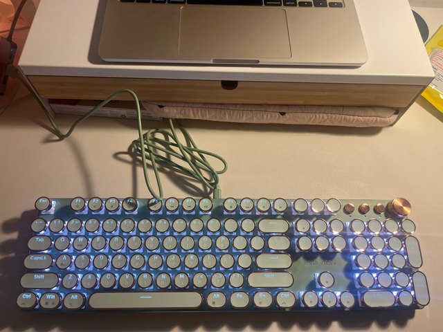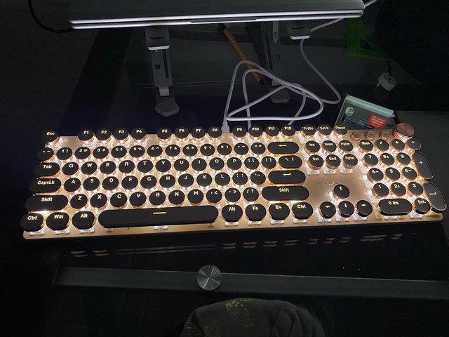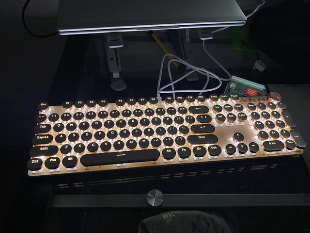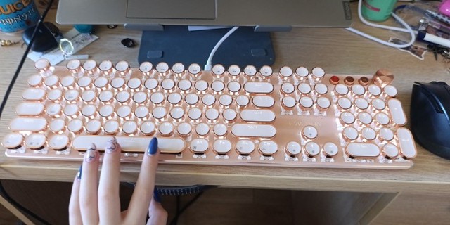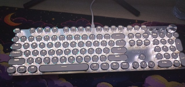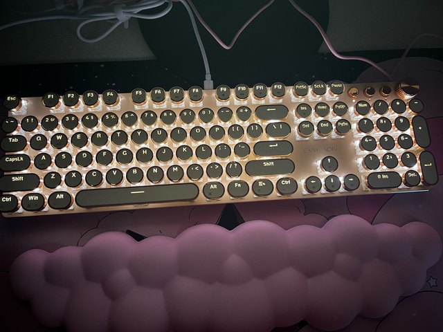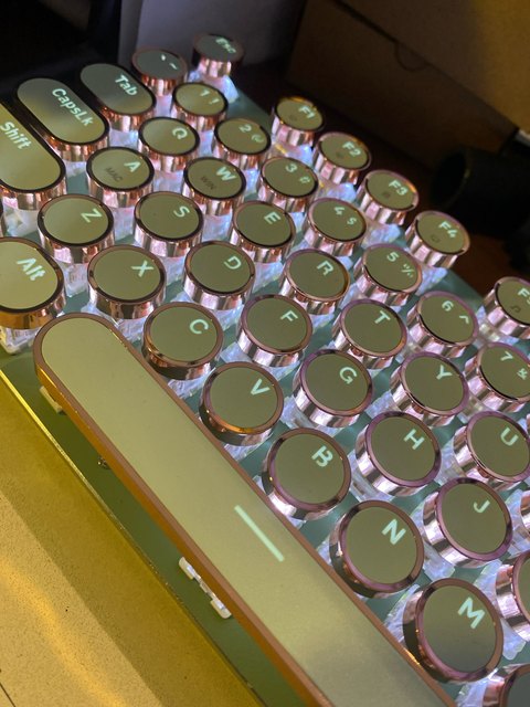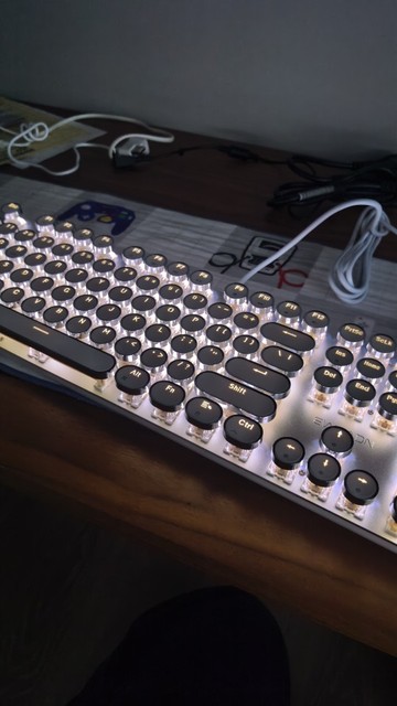 ¡Es tan lindo! Hay muchas maneras diferentes de mostrar la luz que proviene de las teclas y se ve fiel a la imagen. Compré la versión inalámbrica, por lo que fue un poco cara, por lo que por el precio desearía que el sonido de las teclas tuviera más clic y que realmente sonara como si estuviera usando una máquina de escribir, pero en general estoy satisfecho con él. Dicho esto, la calidad podría ser mejor ya que se siente como si las teclas se desprenderían si se usan un poco más agresivamente o si eres un typerr rápido, así que ten en cuenta si estás pensando en comprarlo para jugar. Sinceramente espero que dure mucho.