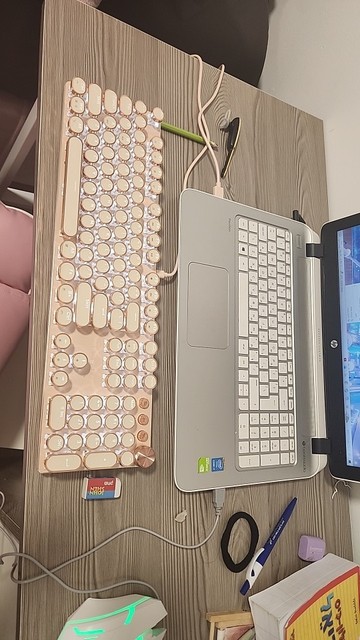 Un teclado hermoso que es más de color melocotón que rosa, lo cual me queda mucho mejor personalmente. Tiene retroiluminación y un sonido agradable. Mañana revisaré las opciones.